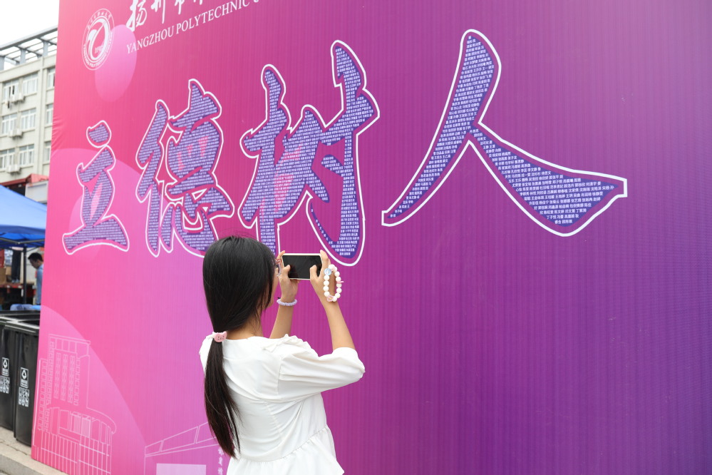 自己的名字出现在校园巨大展板上,是怎样的体验?在职大瘦西湖校区和高邮湖校区,两块巨大的展板格外醒目,展板上印着近5000名新生名字组成校训“立德树人知行合一”八个大字。